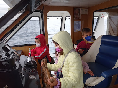 Ahir vam anar en vaixell i el capità ens va deixar portar el timó. Ens ho estem passant molt bé.